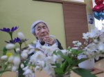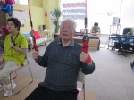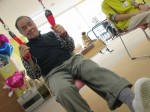 バイクをこぎながらスタッフと楽しく会話をしています。